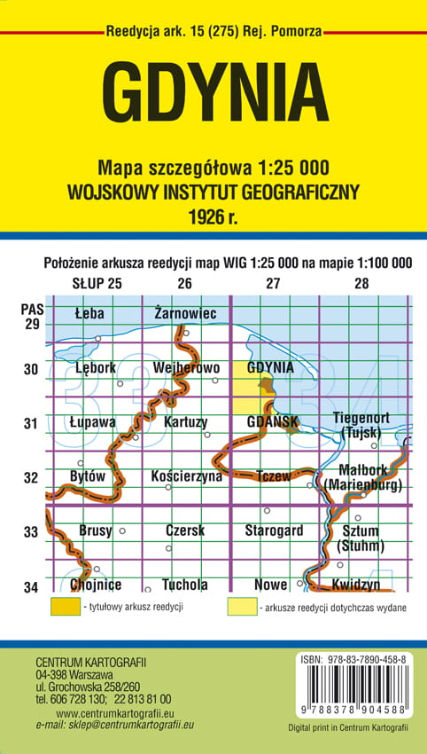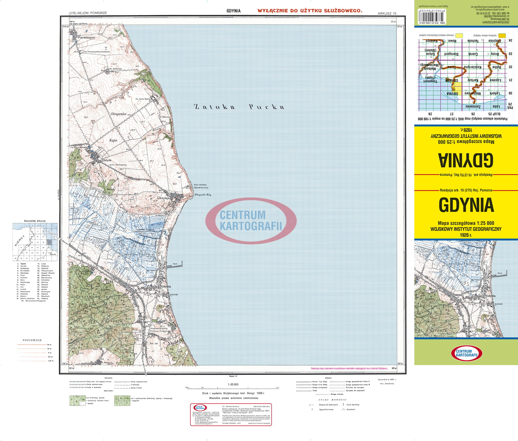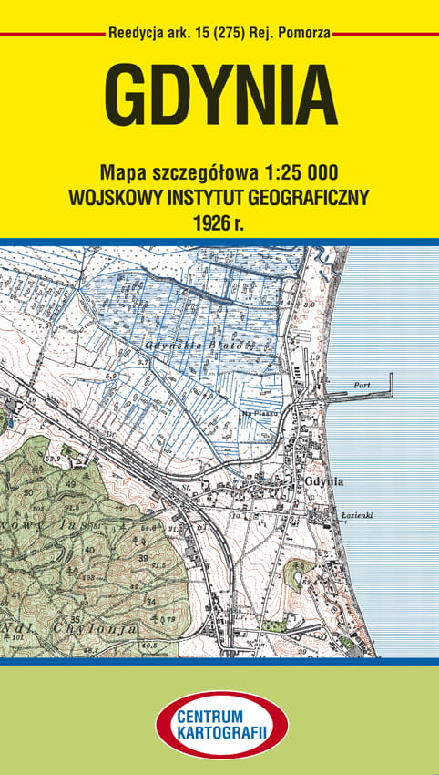 GDYNIA ark.15(275) Rejon Pomorza "Wyłącznie do użytku służbowego". Reedycja mapy szczegółowej w skali 1:25 000 Wojskowego Instytutu Geograficznego, Warszawa 1926 r. Odwzorowanie quasi-stereograficzne WIG. Arkusz jednobarwny obejmuje obszar: na E 36 st. 10' - 36 st. 20' (na wsch. od Ferro) x N 54 st. 30' - 54 st. 36'. Arkusz mapy na dole ma "podstawową" legendę i skalę. W celach wydawniczych dodaliśmy okładkę oraz własną charakterystykę wigowskiej mapy taktycznej 1:25 000 . Wymiary arkusza wydawniczego: szer. 68 cm x wys. 58 cm, po złożeniu: 13,6 cm x 24 cm. Wydawcą jest Centrum Kartografii, wydanie I, 2015 r., druk cyfrowy.