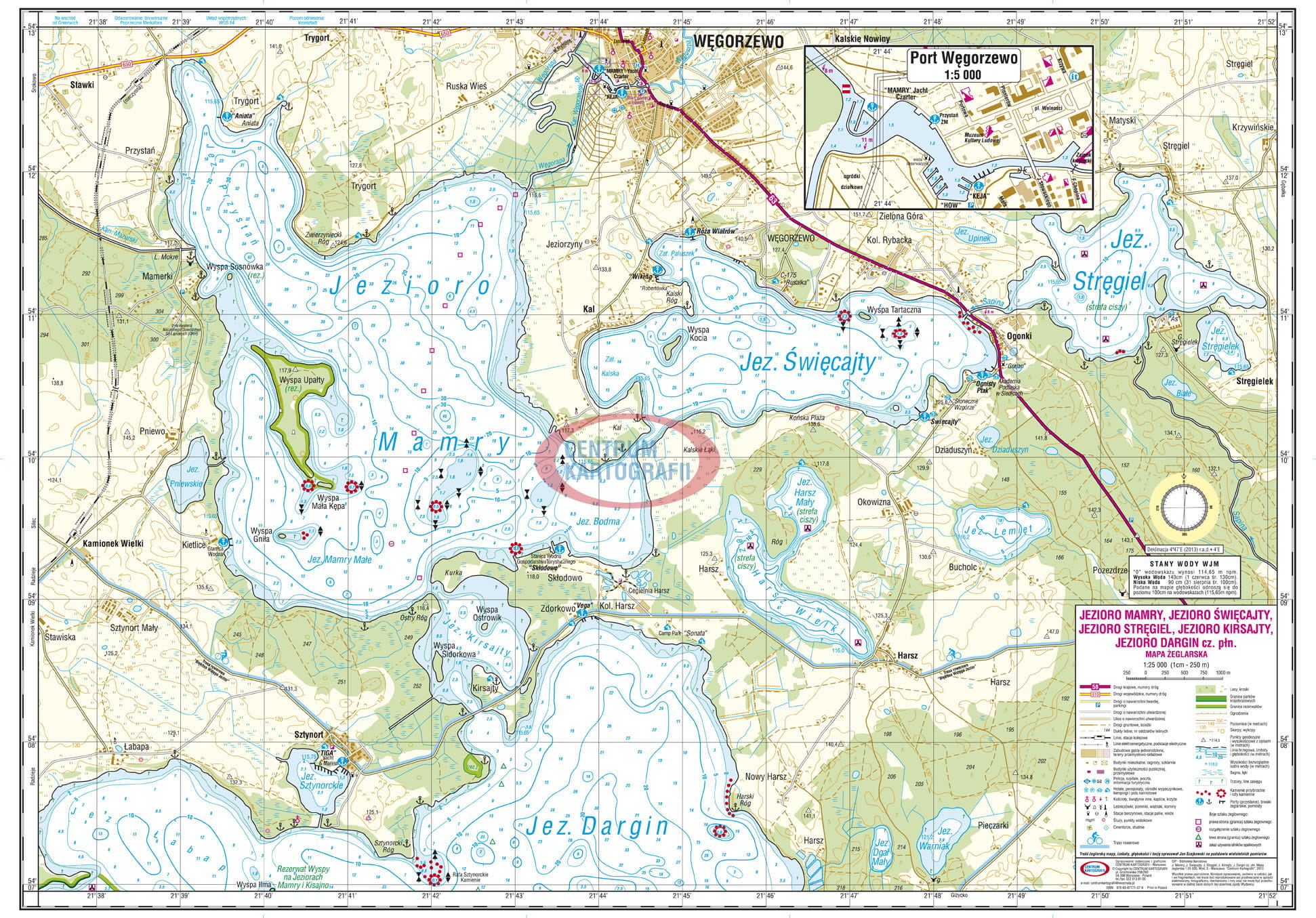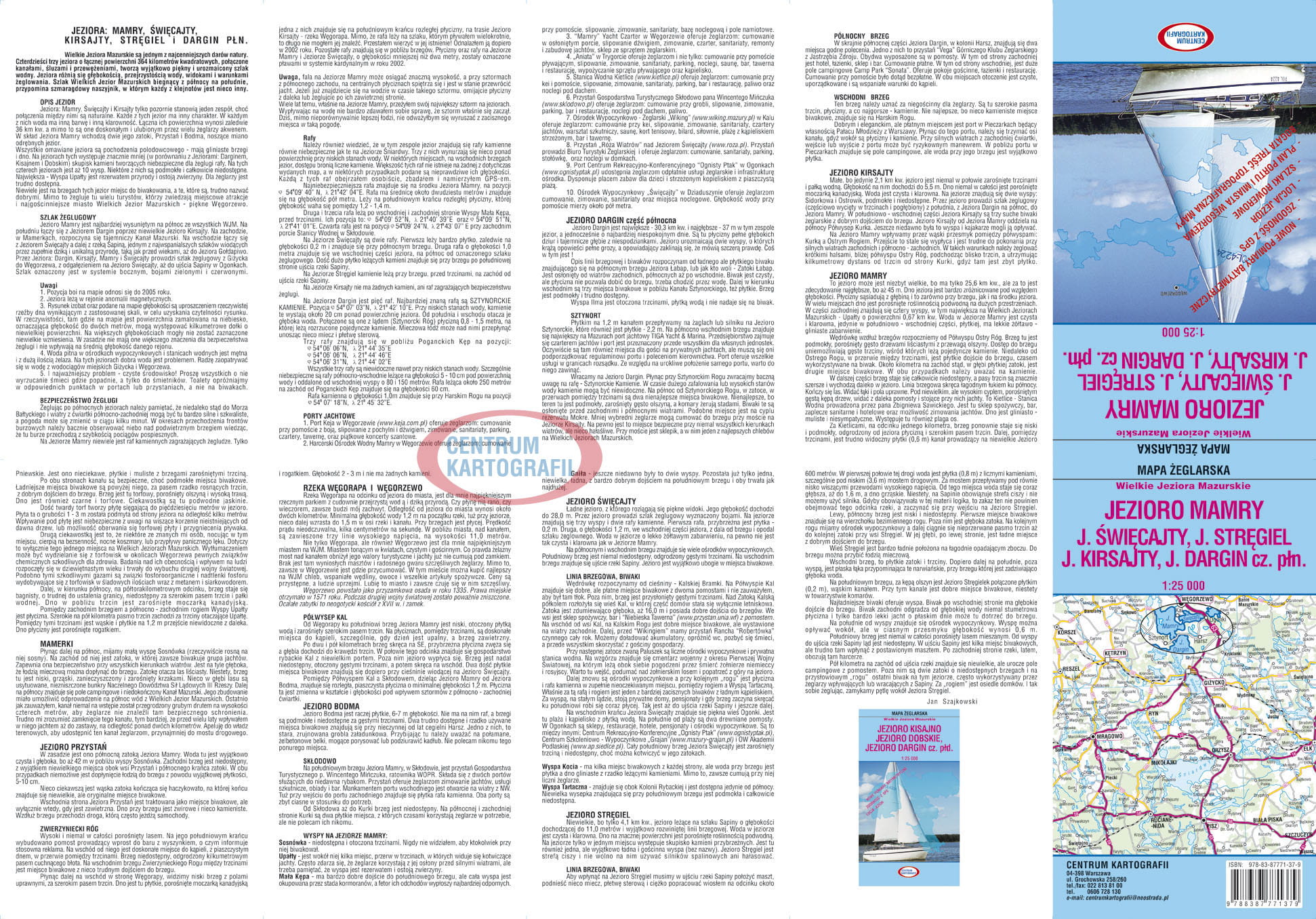 Jezioro Mamry, Jezioro Święcajty, Jezioro Stręgiel, Jezioro Kirsajty, Jezioro Dargin cz. płn. Mapa żeglarska 1:25 000. Przód mapy to głównie jeziora: Dargin - część północna, Kirsajty, Mamry, Święcajty, Stręgiel. Na arkuszu mapy są jeszcze jeziora: Sztynorckie, Pniewskie, Dgał Mały, Warniak, Harsz Wielki i Harsz Mały, Lemięt, Dziaduszyn, Białe, Stręgielek i Upinek. W górnym prawym rogu został umieszczony Plan Portu Węgorzewo 1:5 000. Najmocniejszą stroną mapy jest szczegółowa batymetria jezior. Bardzo dokładnie wrysowane są rafy kamienne jak i kamienie przybrzeżne, porty, przystanie, biwaki żeglarskie i pojedyncze pomosty. Naniesione są boje szlaków żeglownych. Nie pominęliśmy oznakowania i opisów rezerwatów przyrody. Wyróżnikiem naszej mapy żeglarskiej jest szczegółowa Locja. Opisuje akwen wodny, zwłaszcza linię brzegową z biwakami, bezpieczeństwo żeglugi, porty jachtowe (lokalizacja i dane teleadresowe). Podajemy także nr telefonu ratunkowego nad wodą: 601 100 100 i lokalizację bazy Mazurskiego Ochotniczego Pogotowia Ratunkowego w Przystani Gospodarstwa Turystycznego w Skłodowie. Charakteryzujemy System Sygnalizacji Ostrzegawczej z podaniem współrzędnych masztów na Mamrach i Jeziorze Święcajty. Mapa posiada bogatą treść topograficzną z ukształtowaniem terenu, zabudową, drożnią i charakterystyką lasów z numerami działów leśnych. Nie zapomnieliśmy wrysować trasy wytyczonych szlaków rowerowych z ich nazwami i rozróżnieniem kolorów. Szczegółowa legenda została umieszczona na mapie w prawym dolnym rogu, a nad nią opis "Stanu wód Wielkich Jezior Mazurskich" i "Deklinacja" magnetyczna. Odwzorowanie: Uniwersalne poprzeczne Merkatora. Arkusz czterobarwny obejmuje obszar: E 21 st. 38' - 21 st. 52' x N 54 st. 07' - 54 st. 13'. Wymiary arkusza wydawniczego: 47,8 cm x 68,5 cm, po złożeniu: 23,9 cm x 13,7 cm. Centrum Kartografii, wydanie 5, 2024 r., druk offsetowy. Mapa laminowana dwustronnie na gorąco.