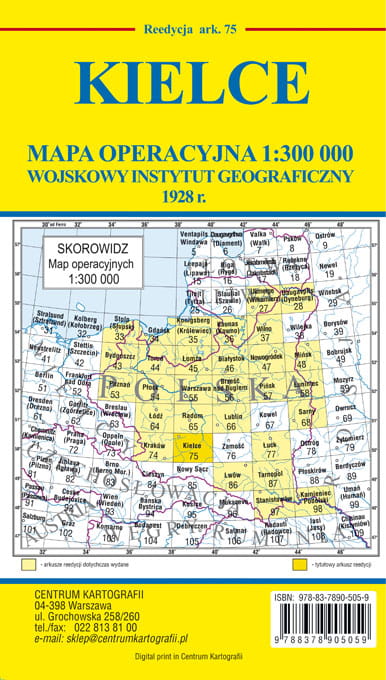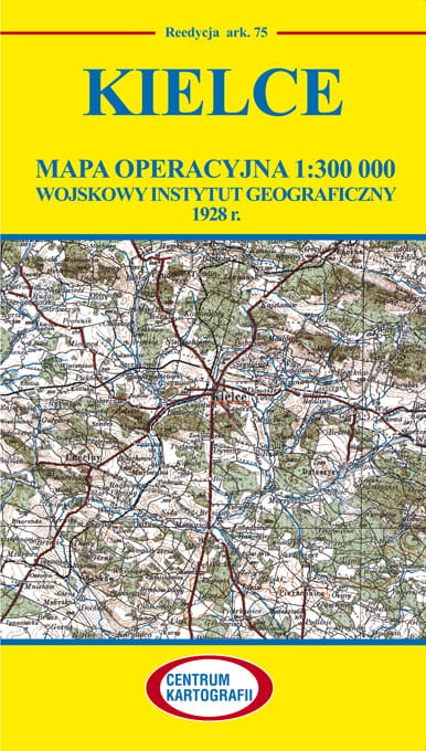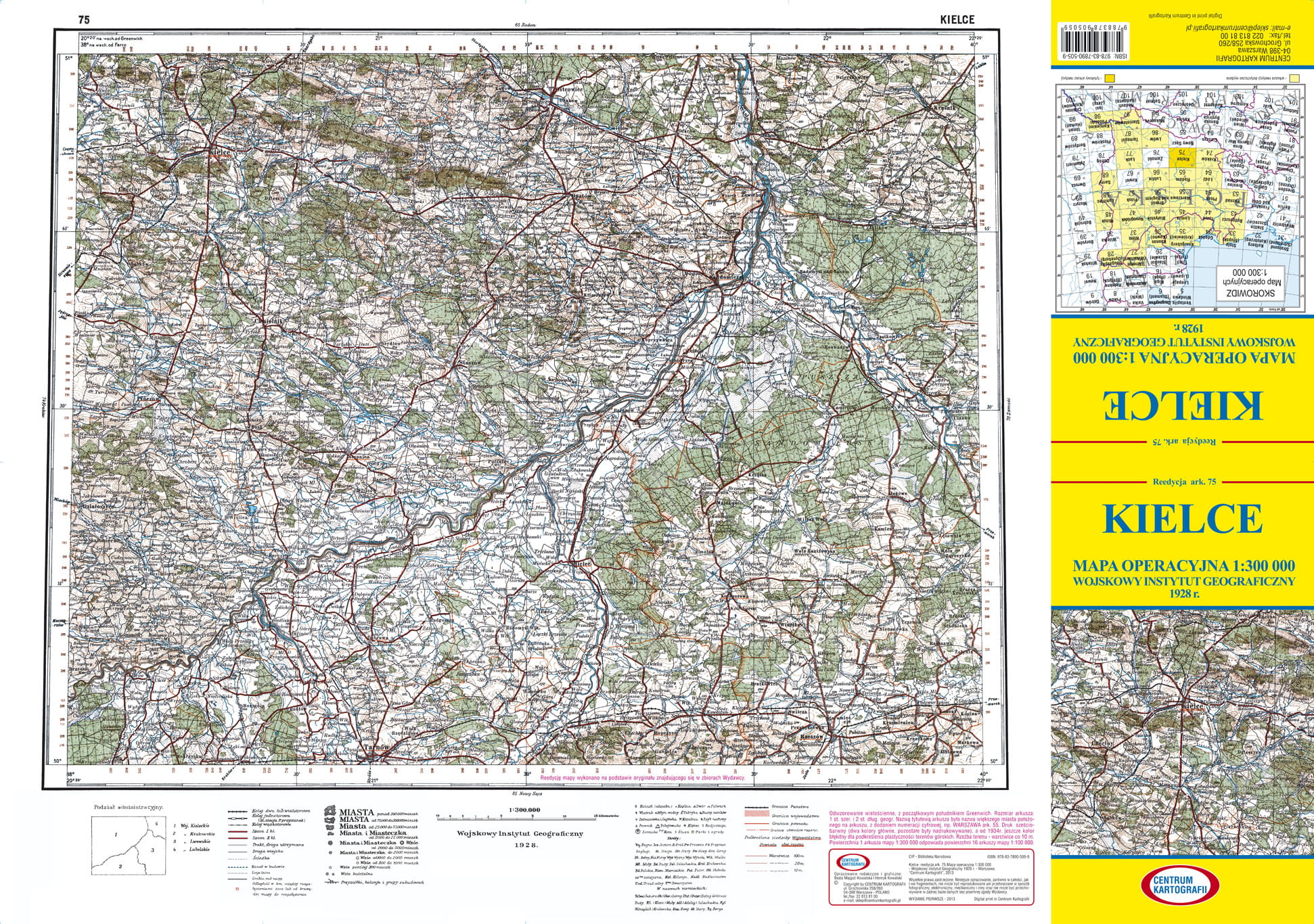 KIELCE: reedycja ark. 75 Mapy operacyjnej 1:300 000, Wojskowego Instytutu Geograficznego wydanej w 1928 r. w Warszawie. Odwzorowanie quasi-stereograficzne WIG. Rozmiar arkusza: 50 st. - 51 st. szer. geograficznej północnej i 20 st. 20' - 22 st. 20' dług. geograficznej wschodniej. Nazwą tytułową jest największe miasto położone na arkuszu tj. Kielcei numer cyfrowy 45. Druk mapy był sześciobarwny (dwa kolory główne, pozostałe były nadrukowywane). Rzeźba terenu - warstwice co 10 m. Powierzchnia jednego arkusza mapy 1:300 000 odpowiadała powierzchni 16 arkuszy mapy 1:100 000 WIG. Mapa była używana na wszystkich szczeblach dowodzenia. Była pierwszą mapa wydawaną w II Rzeczypospolitej przedstawiającą aktualny podział administracyjny na województwa i powiaty. Mapa charakteryzowała się dużą szczegółowością. Wiernie przedstawiała sieć osadniczą i komunikacyjną, a także pokrycie danego terenu lasami. Opis poza ramką zawierał szkic podziału administracyjnego i objaśnienia znaków topograficznych. W celach wydawniczych dodaliśmy okładkę oraz własną charakterystykę wigowskiej mapy operacyjnej 1:300 000. Wymiary naszego arkusza wydawniczego to: 68 cm x 48 cm, po złożeniu: 24 cm x 13,6 cm. Centrum Kartografii, wydanie pierwsze 2013 r. Druk cyfrowy.