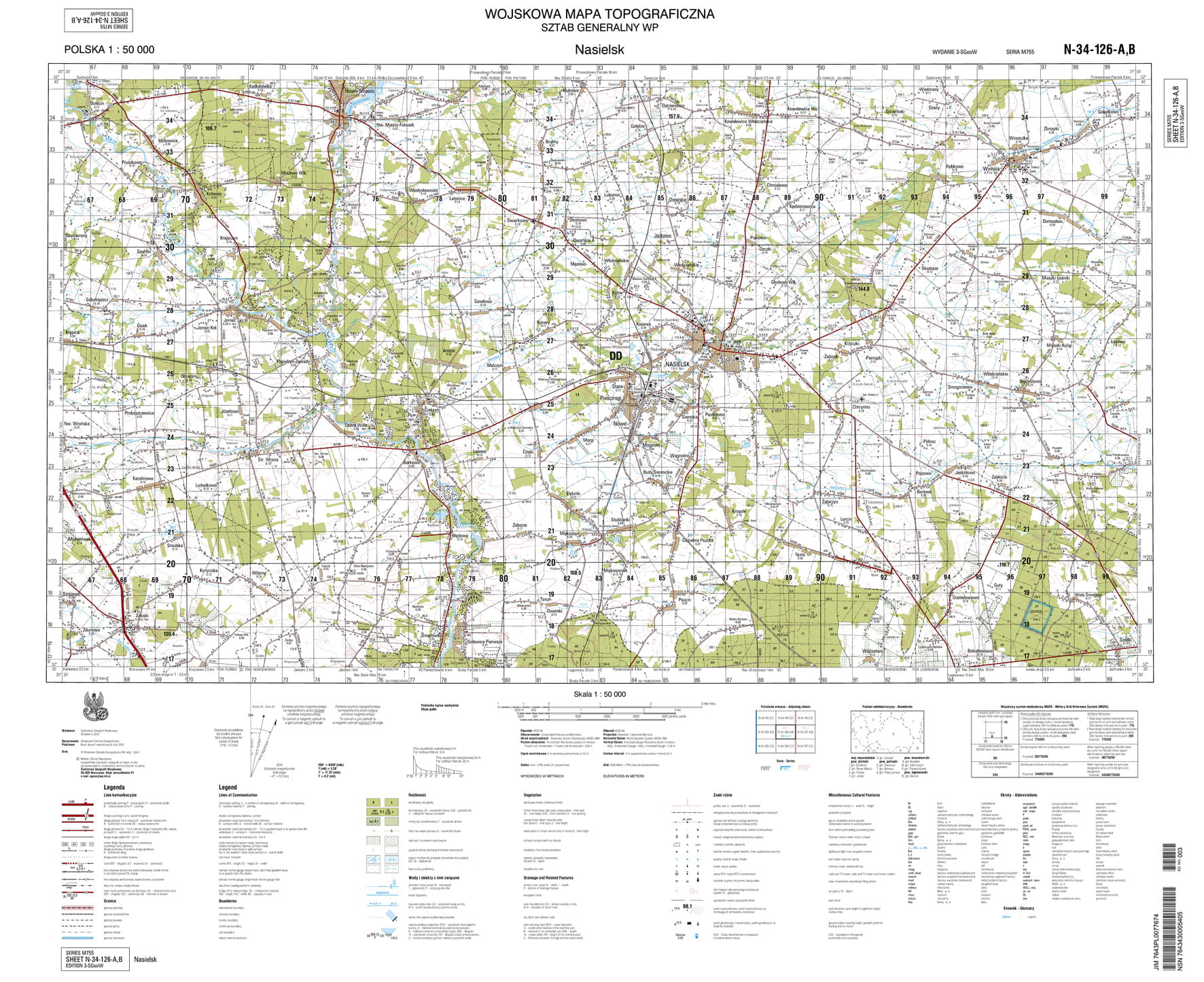 N-34-126-AB Nasielsk. Elipsoida: WGS-84, Odwzorowanie: Uniwersalne Poprzeczne Merkartora, Układ współrzędnych: Światowy System Geodezyjny (WGS) 1984, Poziom odniesienia: Kronsztadt. Wysokości podano w metrach. Cięcie warstwicowe: 5 m, warstwice pomocnicze co 2,5 m. Siatka: 1 km - UTM, strefa 34 (opisane linie). Obszar mapy: E 20 st. 30" - E 21 st. 00", N 52 st. 40" - 52 st. 30". Obszar płaskiego arkusza: szer. 75 cm , wys. 62, druk wielobarwny. Wydanie 3, 2013 r. Każdy arkusz posiada skalę liniową i mianowaną, szczegółową legendę znaków topograficznych oraz wykaz użytych skrótów. Umieszczono także rysunki: "Położenie arkusza", "Podział administracyjny" obszaru mapy i przydatny "Wojskowy system meldunkowy MGRS" Wszystkie opisy w legendzie są po polsku i angielsku.