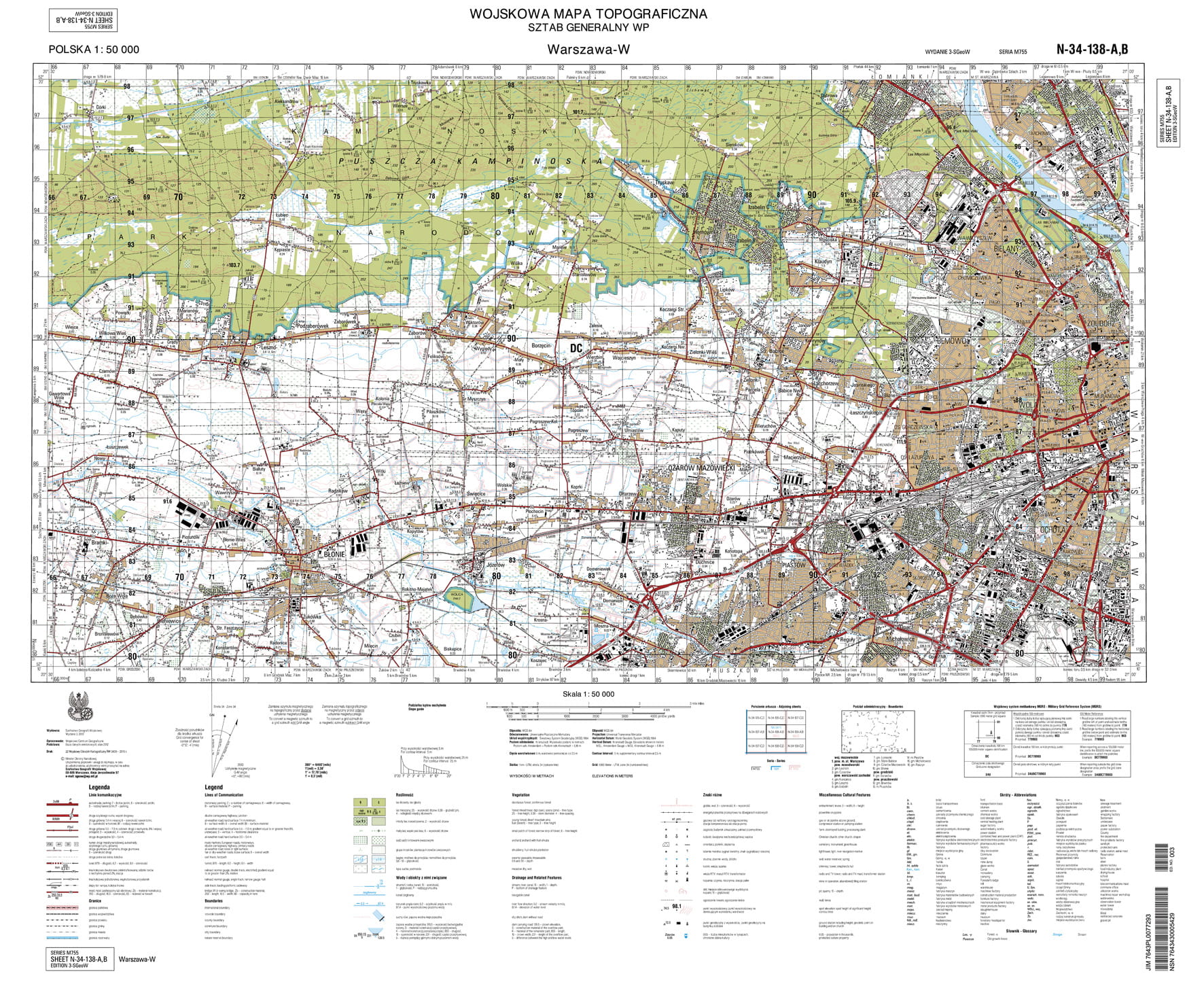 N-34-138-AB Warszawa Zachód. Elipsoida: WGS-84, Odwzorowanie: Uniwersalne Poprzeczne Merkartora, Układ współrzędnych: Światowy System Geodezyjny (WGS) 1984, Poziom odniesienia: Kronsztadt. Wysokości podano w metrach. Cięcie warstwicowe: 5 m, warstwice pomocnicze co 2,5 m. Siatka: 1 km - UTM, strefa 34 (opisane linie). Obszar mapy: E 20 st. 30" - E 21 st. 00", N 52 st. 20" - 52 st. 10". Obszar płaskiego arkusza: szer. 75 cm , wys. 62, druk wielobarwny. Wydanie 3, 2013 r. Każdy arkusz posiada skalę liniową i mianowaną, szczegółową legendę znaków topograficznych oraz wykaz użytych skrótów. Umieszczono także rysunki: "Położenie arkusza", "Podział administracyjny" obszaru mapy i przydatny "Wojskowy system meldunkowy MGRS" Wszystkie opisy w legendzie są po polsku i angielsku.