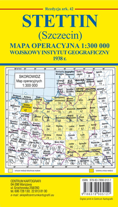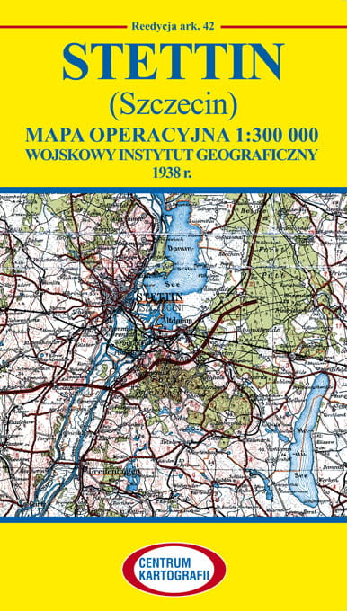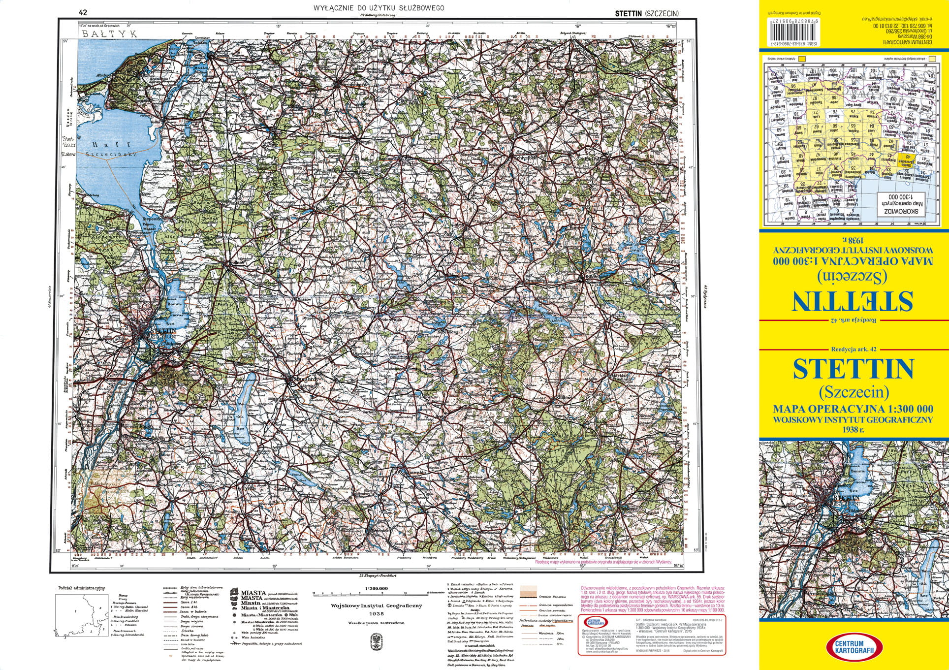 STETTIN (Szczecin): reedycja ark. 32 Mapy operacyjnej 1:300 000, Wojskowego Instytutu Geograficznego wydanej w 1937 r. w Warszawie. Arkusz "WYŁĄCZNIE DO UŻYTKU SŁUŻBOWEGO". Odwzorowanie quasi-stereograficzne WIG. Rozmiar arkusza: 53 st. - 54 st. szer. geograficznej północnej i 14 st. 20' - 16 st. 20' dług. geograficznej wschodniej. Nazwą tytułową jest największe miasto położone na arkuszu tj. Stettin (Szczecin) i numer cyfrowy 42. Druk mapy był sześciobarwny (dwa kolory główne, pozostałe były nadrukowywane). Rzeźba terenu - warstwice co 10 m. Powierzchnia jednego arkusza mapy 1:300 000 odpowiadała powierzchni 16 arkuszy mapy 1:100 000 WIG. Mapa była używana na wszystkich szczeblach dowodzenia. Była pierwszą mapa wydawaną w II Rzeczypospolitej przedstawiającą aktualny podział administracyjny na województwa i powiaty. Mapa charakteryzowała się dużą szczegółowością. Wiernie przedstawiała sieć osadniczą i komunikacyjną, a także pokrycie danego terenu lasami. Opis poza ramką zawierał szkic podziału administracyjnego i objaśnienia znaków topograficznych. W celach wydawniczych dodaliśmy okładkę oraz własną charakterystykę wigowskiej mapy operacyjnej 1:300 000. Wymiary naszego arkusza wydawniczego to: 68 cm x 48 cm, po złożeniu: 24 cm x 13,6 cm. Centrum Kartografii, wydanie pierwsze 2015 r. Druk cyfrowy.