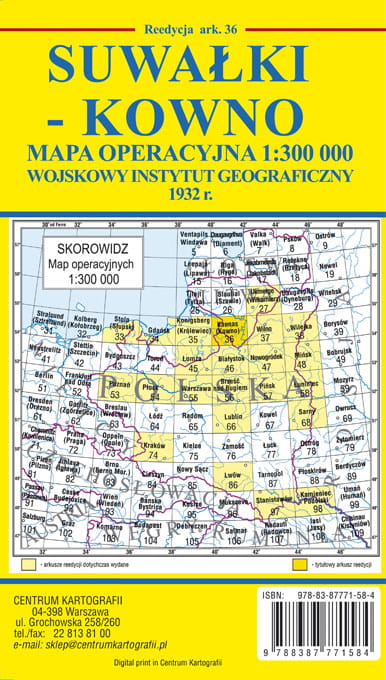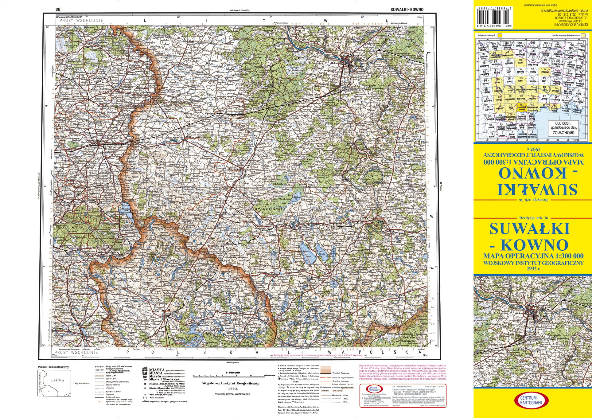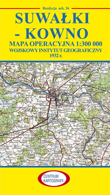 SUWAŁKI-KOWNO: reedycja ark. 36 Mapy operacyjnej 1:300 000, Wojskowego Instytutu Geograficznego wydanej w 1932 r. w Warszawie. Odwzorowanie quasi-stereograficzne WIG. Rozmiar arkusza: 54 st. - 55 st. szer. geograficznej północnej i 22 st. 20' - 24 st. 20' dług. geograficznej wschodniej. Nazwą tytułową jest największe miasto położone na arkuszu to Suwałki (po stronie polskiej) oraz Kowno (na Litwie) i numer cyfrowy 36. Druk mapy był sześciobarwny (dwa kolory główne, pozostałe były nadrukowywane). Rzeźba terenu - warstwice co 10 m. Powierzchnia jednego arkusza mapy 1:300 000 odpowiadała powierzchni 16 arkuszy mapy 1:100 000 WIG. Mapa była używana na wszystkich szczeblach dowodzenia. Była pierwszą mapa wydawaną w II Rzeczypospolitej przedstawiającą aktualny podział administracyjny na województwa i powiaty. Mapa charakteryzowała się dużą szczegółowością. Wiernie przedstawiała sieć osadniczą i komunikacyjną, a także pokrycie danego terenu lasami. Opis poza ramką zawierał szkic podziału administracyjnego i objaśnienia znaków topograficznych. W celach wydawniczych dodaliśmy okładkę oraz własną charakterystykę wigowskiej mapy operacyjnej 1:300 000. Wymiary naszego arkusza wydawniczego to: 68 cm x 48 cm, po złożeniu: 24 cm x 13,6 cm. Centrum Kartografii, wydanie pierwsze 2011 r. Druk cyfrowy.