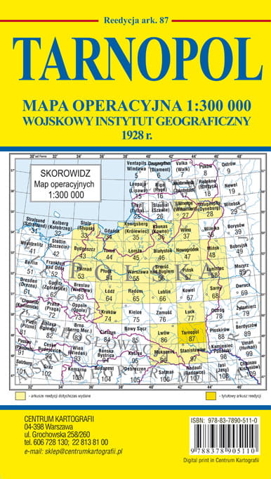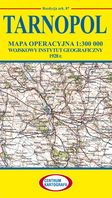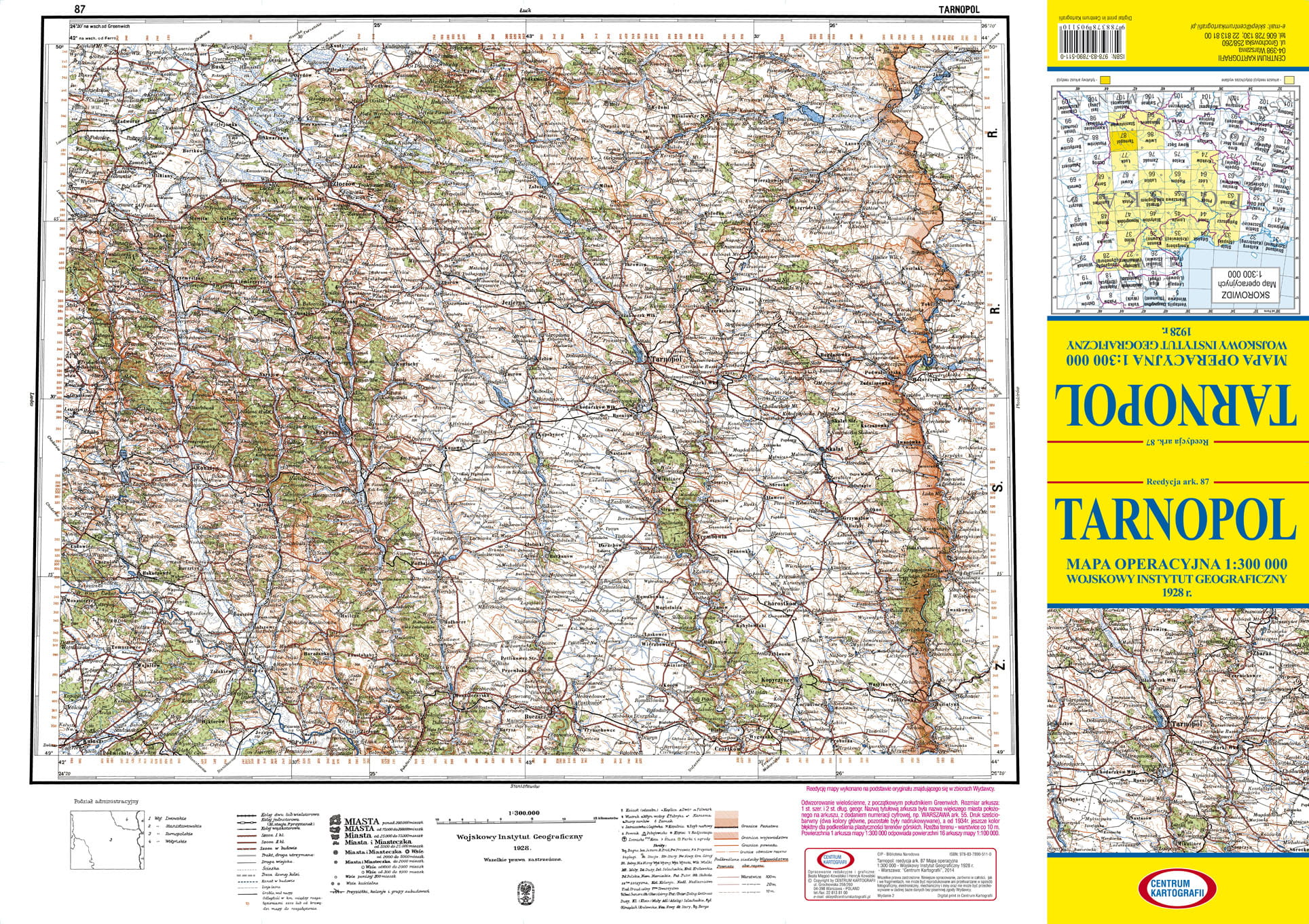 TARNOPOL: reedycja ark. 87 Mapy operacyjnej 1:300 000, Wojskowego Instytutu Geograficznego wydanej w 1928 r. w Warszawie. Odwzorowanie quasi-stereograficzne WIG. Rozmiar arkusza: 49 st. - 50 st. szer. geograficznej północnej i 24 st. 20' - 26 st. 20' dług. geograficznej wschodniej. Nazwą tytułową jest największe miasto położone na arkuszu tj. Tarnopol i numer cyfrowy 87. Druk mapy był sześciobarwny (dwa kolory główne, pozostałe były nadrukowywane). Rzeźba terenu - warstwice co 10 m. Powierzchnia jednego arkusza mapy 1:300 000 odpowiadała powierzchni 16 arkuszy mapy 1:100 000 WIG. Mapa była używana na wszystkich szczeblach dowodzenia. Była pierwszą mapa wydawaną w II Rzeczypospolitej przedstawiającą aktualny podział administracyjny na województwa i powiaty. Mapa charakteryzowała się dużą szczegółowością. Wiernie przedstawiała sieć osadniczą i komunikacyjną, a także pokrycie danego terenu lasami. Opis poza ramką zawierał szkic podziału administracyjnego i objaśnienia znaków topograficznych. W celach wydawniczych dodaliśmy okładkę oraz własną charakterystykę wigowskiej mapy operacyjnej 1:300 000. Wymiary naszego arkusza wydawniczego to: 68 cm x 48 cm, po złożeniu: 24 cm x 13,6 cm. Centrum Kartografii, wydanie drugie 2014 r. Druk cyfrowy.